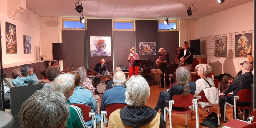 Zondag 1 juni was het werk van Braquo achtergronddecor voor het jazzkwartet Sinaasappels